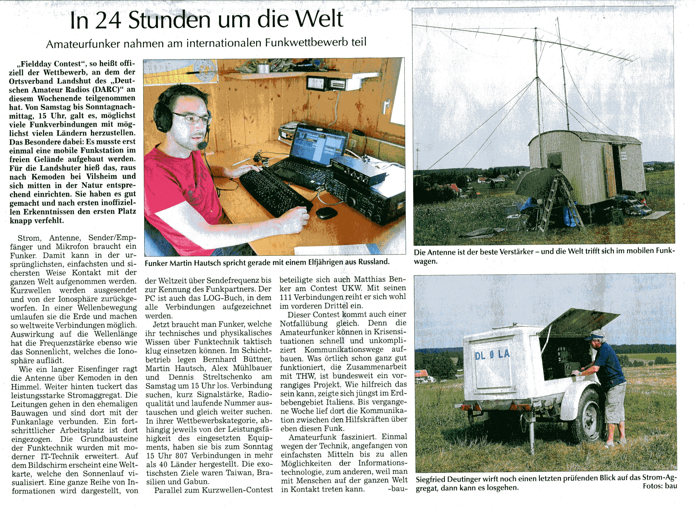 06.09.16: DK0MN/p im SSB-Fieldday-Contest 2016; bekannte vorläufige Ergebnisse (13.12. 2133z)Am 3./4. September 2016 hat unser Ortsverband wieder mit dem Rufzeichen DK0MN/p am IARU-Region-1-SSB-Fieldday-Contest in der Klasse "Portable, multi operator, low power, non-assisted" mit 100 W HF und einer Drahtantenne teilgenommen. Dies war die 53. (!) Fieldday-Teilnahme von C12 seit dem SSB-Fieldday im September 1990. Seither haben wir bei jedem Fieldday-Contest ein Log eingereicht. Am Freitag waren frühzeitig genügend Leute da, so daß der Aufbau der drei großen Zelte recht flott ging. Auch die Antenne hing bereits am Freitagabend. Es gab ein technisches Problem: unser selbstgebauter DC-DC-Wandler von 13.8 V auf 19.5 V versagte den Dienst und konnte am Fieldday-QTH nicht repariert werden. Deshalb mußte der Stations-PC diesmal mit dem 230 V - Netzteil betrieben werden. Am Samstagmittag gab es wieder Gemüsesuppe (tnx an DG8MDN und die vielen Küchenhelfer). Bettinas Kartoffelsalat war hervorragend! Leider waren die Bedingungen auf den oberen Bändern recht mäßig. In der letzten Stunde konnten wir dann doch noch QSOs auf 15 m und 10 m fahren und einige Multis arbeiten. Fast die gesamte Nachtschicht (DK3YD) wurde auf 80 m verbracht. 160 m fehlt sehr. Die OPs waren: Alex, DC1LEX; Toby, DD5FZ; Simon, DJ4MZ; Hans, DK3YD; Martin, DL4NAC; Horst, DL6NDW; und Bodo, DL9MFY. Am Sonntag erschienen Franta, DJ0ZY, und Rudolf, DJ3WE, als Fieldday-Kontrolle (siehe Fotos unten). Trotz genauer Prüfung konnten sie keine Regelverstöße feststellen. Anschließend konnten wir uns mit Franta und Rudolf noch in gemütlicher Runde unterhalten. Mit Besucherinnen und Besuchern waren wir insgesamt 20 Personen am Fieldday-QTH. Das Wetter war diesmal optimal: nicht zu heiß, leichter Wind, keinerlei Regen. Das vorläufige Ergebnis von DK0MN/p befindet sich im Anhang. Gleichzeitig haben wir vom Fieldday-Standort mit eigenen Rufzeichen am UKW-Contest teilgenommen (tnx DG8MDN, DL6NDW, DL7MY, DL9MFY). Horst, DL6NDW, baute mit mehreren Helfern seine leistungsfähige 2m-Station auf. Im Namen unseres Ortsverbandes danke ich wieder recht herzlich allen, die zum Gelingen dieser Aktivitäten beigetragen haben. Die Liste der eingereichten Fieldday-Logs sowie Soapbox und Fotogalerie gibt es bei Bilder vom Fieldday bei DL0LA/p (OV Landshut U08): Bericht vom Fieldday bei DP6M/p (OV Ettlingen A24): Bilder vom Fieldday bei DF0M/p (OV München-Süd C18):